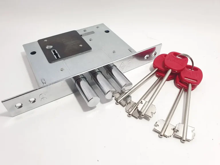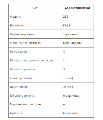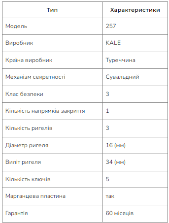 Двері обладнані наступними замками: Верхнім сувальдним замком Kale 257 турецького виробництва, який в комплекті має 5 ключів. Закривається на два півоберта. Діаметр ригеля замка – 16 мм, виліт ригеля – 34 мм. Та нижнім замком Kale 252 з циліндровим механізмом Kale 50х50Т. Який має три ригелі діаметром 16 мм, виліт ригелей – 34 мм. Гарантія на замки та циліндр 5 років.