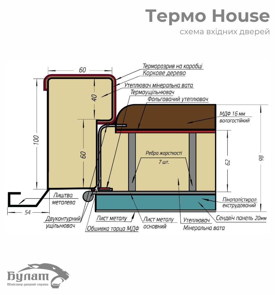 Коробка та дверне полотно утеплені мінеральною ватою та фольгованим утеплювачем, що допоможе зберегти тепло всередині приміщення та запобігти проникненню холодного повітря. Також двері укомплектовані двома контурами євро ущільнювача, який забезпечує ефективну теплоізоляцію та шумоізоляцію в квартирі.