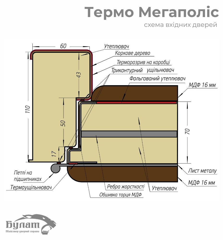 Коробка та дверне полотно утеплені мінеральною ватою та фольгованим утеплювачем, що допоможе зберегти тепло всередині приміщення та запобігти проникненню холодного повітря. Також двері укомплектовані двома контурами євро ущільнювача, який забезпечує ефективну теплоізоляцію та шумоізоляцію в квартирі.