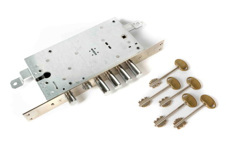 Двері обладнані моноблоком Mottura 54.797 з цилідровим та сувальдним замками. Діаметр ригеля замка – 18 мм, виліт ригеля – 36 мм. Циліндровий механізм Securemme К-2, розмір 50х30 шток.